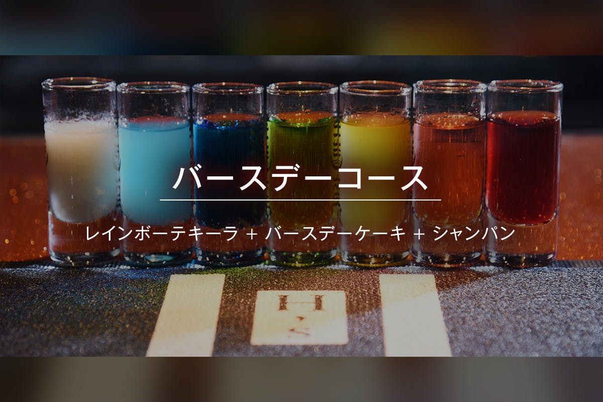 西麻布で記念日を楽しめるよう、バースデーケーキとレインボーテキーラで華やかに祝います。さらにシャンパン1本(12,000円相当)を提供いたします。