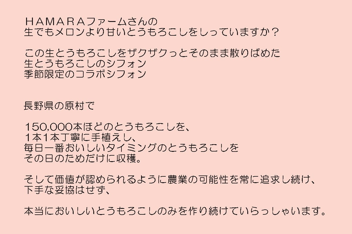 はじめて 月のひるね さんから、私たちのとうもろこしを使ってシフォンケーキを作ってみたいとご相談いただいた時は、正直どんな味になるのか想像もつきませんでした。