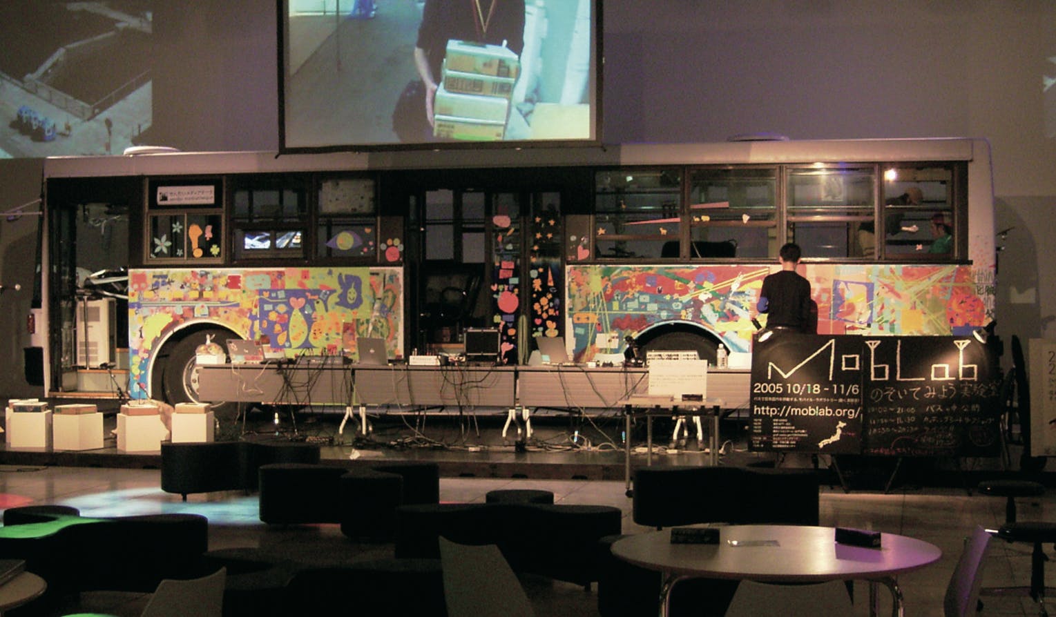 MobLab(2005)日独のメディアアーティストを載せ、各地のメディアセンターを巡りました。位置情報やサーバーのシステムを使い、移動するラボとして各地で展示や公開性制作などを行いました。