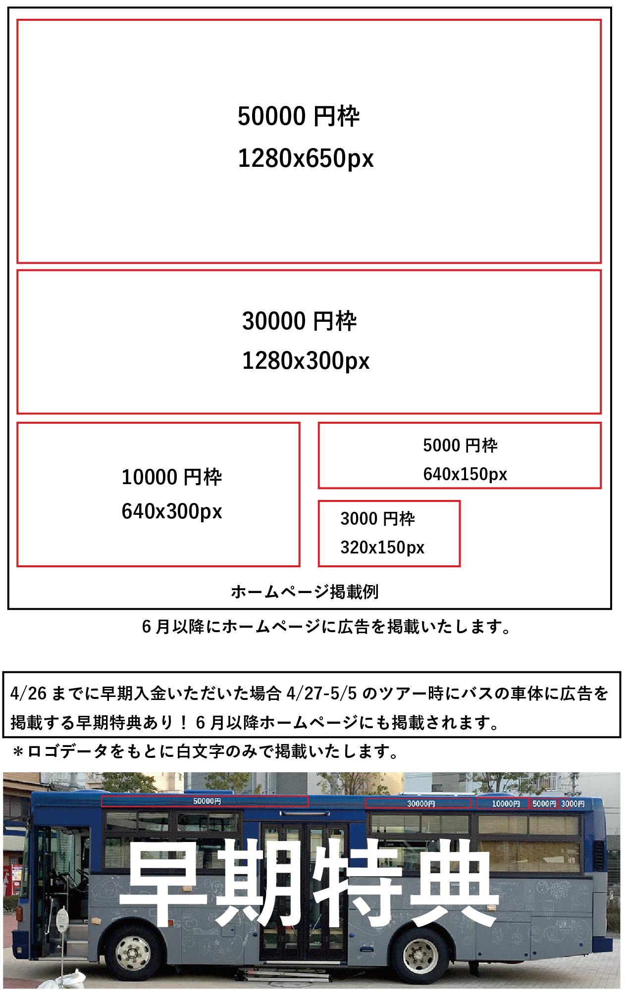 *早期特典として、4/26までに入金をしていただいた場合、4/27-5.5のツアー時にバスの車体に広告を掲載いたします。6月以降はホームページにも掲載いたします。