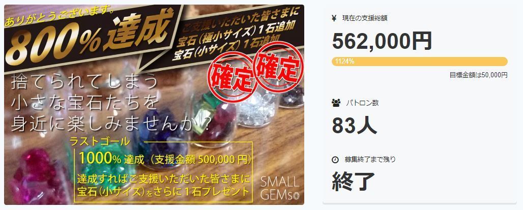 2019年1月に実施いたしました「SMALL GEMs」の第1弾プロジェクトでは、目標の1000%ものご支援をいただきました。