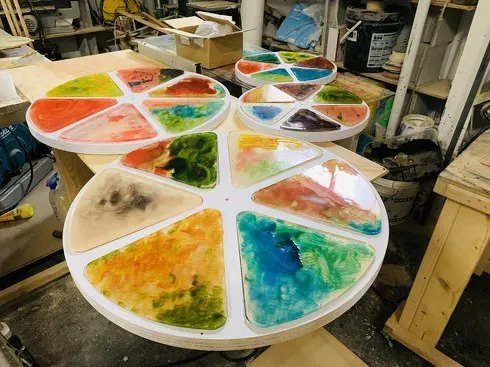 (写真はモバイルハウスの観覧車というパーツで、一枚一枚手書きのステンドグラスです)
