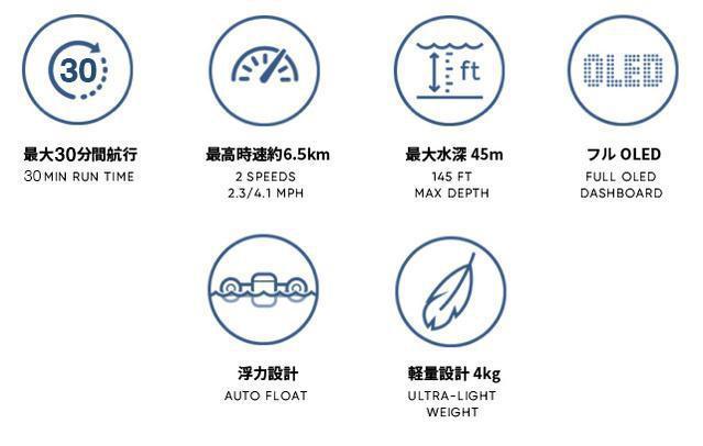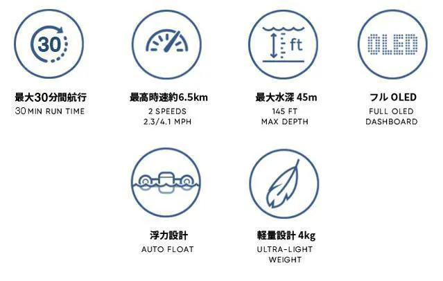 SEAFLYERは、 10,000mAhの内蔵バッテリーにより最大30分間の航行が可能。ダイビングでも沖でのシュノーケリングでも十分な時間楽しむことができます。本体に液晶ディスプレイが装備されておりバッテリー残量が一目でわかるため、急に動作しなくなる心配はいりません。