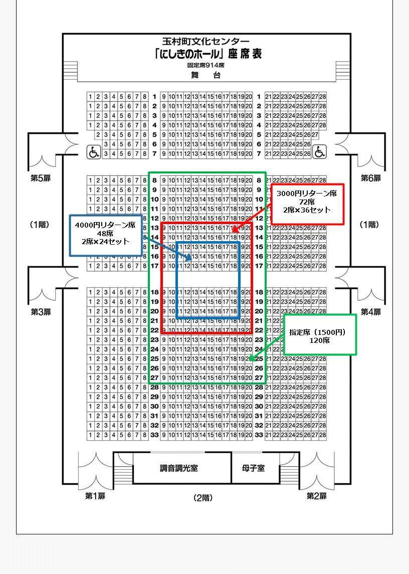 ②は中央付近の赤枠内を、③は赤枠よりさらに中央より優良席の青枠内でご用意いたします。ただし、席はお選びいただけませんので、ご了承ください。