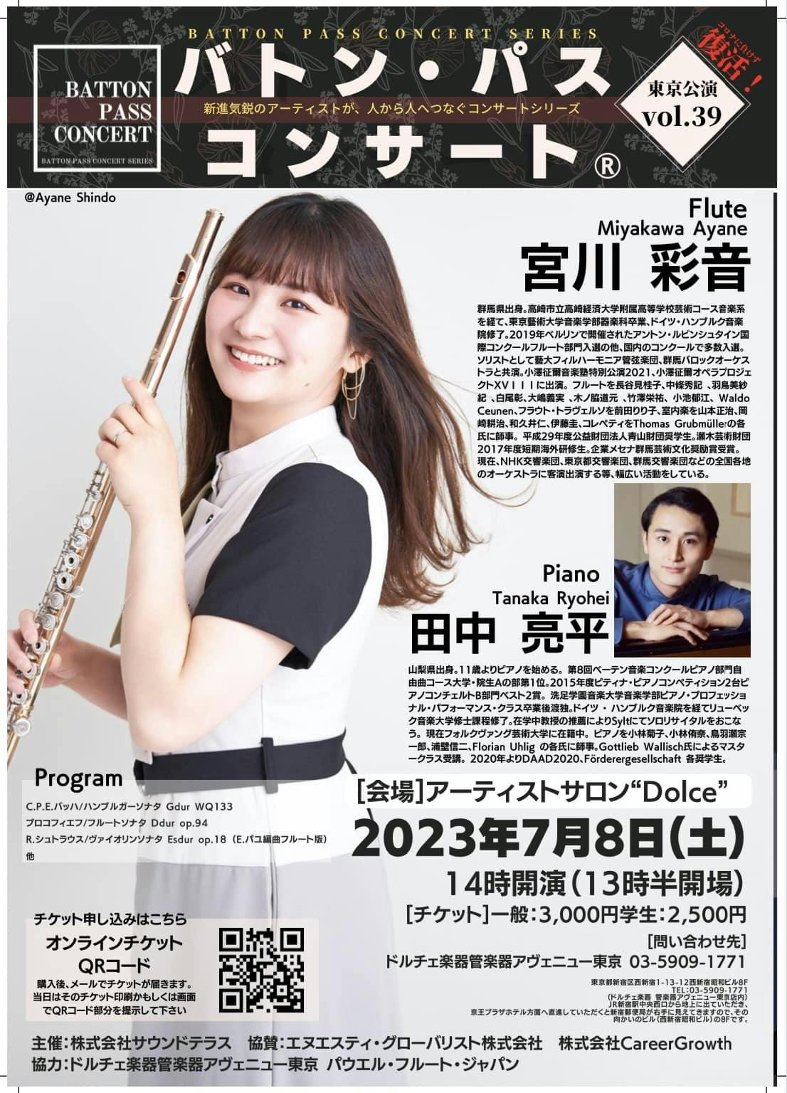 2023/04/16 09:37ロマン派音楽研究会管弦楽団参加者の皆様おはようございます。ロマン派音楽研究会管弦楽団のフルート講師、宮川彩音さんから、リサイタルをはじめ3つの演奏会への出演のご案内です。宮川彩音フルートリサイタル~第39回バトンパスコンサート◆日時:2023年7月8日(土)午後2時開演◆会場:アーティストサロン”Dolce”(新宿区西新宿1-13-12西新宿昭和ビル8F)◆出演:宮川彩音(フルート)、田中亮平(ピアノ)◆曲目:C.P.E.バッハ/ハンブルガーソナタ、プロコフィエフ/フルートソナタ、R.シュトラウス/ヴァイオリンソナタ(フルート版)ほか◆チケット:一般3千円、学生2千5百円 ◆HP:バトンパスコンサート vol.39 宮川 彩音(fl),田中 亮平(pf) (teket.jp)ドイツ・ハンブルク音楽院の同期による意欲的なリサイタル。プロコフィエフ、R.シュトラウスのヴァイオリンソナタ(フルート版)など大作を取り上げます。群馬交響楽団第588回定期演奏会◆日時:2023年5月27日(土)午後4時開演◆会場:高崎芸術劇場 大劇場◆指揮:高関健(群響名誉指揮者)◆ピアノ:児玉桃◆曲目:モーツァルト/交響曲第32番、メシアン/トゥーランガリラ交響曲◆チケット:全席指定 SS席6,500円・S席 5,500円・A席 5,000円・B席 4,000円・C席 3,000円◆HP:第588回定期演奏会 | 群馬交響楽団 (gunkyo.com)宮川さんは、メシアンのトゥーランガリラ交響曲での出演です。NHK交響楽団第1987回 定期公演 Cプログラム◆日時:2023年6月16日(金) 開演 7:30pm(休憩なし) 2023年6月17日(土) 開演 2:00pm(休憩なし)◆会場:NHKホール◆曲目:ショスタコーヴィチ/交響曲 第8番 ハ短調 作品65◆指揮:ジャナンドレア・ノセダ◆チケット:一般S席7,400円、A席6,500円、B席5,200円、C席4,200円◆HP:年月別の公演 | NHK交響楽団 (nhkso.or.jp)宮川さんは、大規模でとても重要なソロパートであるソロピッコロを担当します。 もっと見る【ロマン派音楽研究会管弦楽団】コンビ愛に溢れた若い二人の音楽家が紡ぐチャイコフスキーのピアノ協奏曲