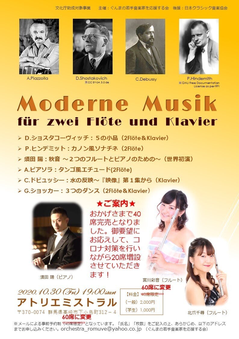 すでにご案内させていただいた『MODERNE MUSIK』~近現代のフルート音楽~ですが、おかげさまで40席完売となりました。御要望にお応えして、コロナ対策を行いながら20席増設させていただきます!