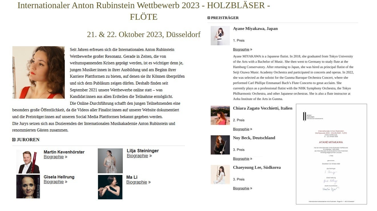 NHK交響楽団、東京都交響楽団、東京フィルハーモニー交響楽団、群馬交響楽団などの客演奏者として、また、ロマン派音楽研究会管弦楽団フルート講師、洗足学園音楽大学管弦楽団演奏補助員として活躍されているフルート奏者の宮川彩音さんが、2023年10月22日、ドイツのデュッセルドルフで審査が実施されたアントン・ルービンシュタイン国際コンクール2023フルート部門(オンライン開催) で第1位を獲得しました。