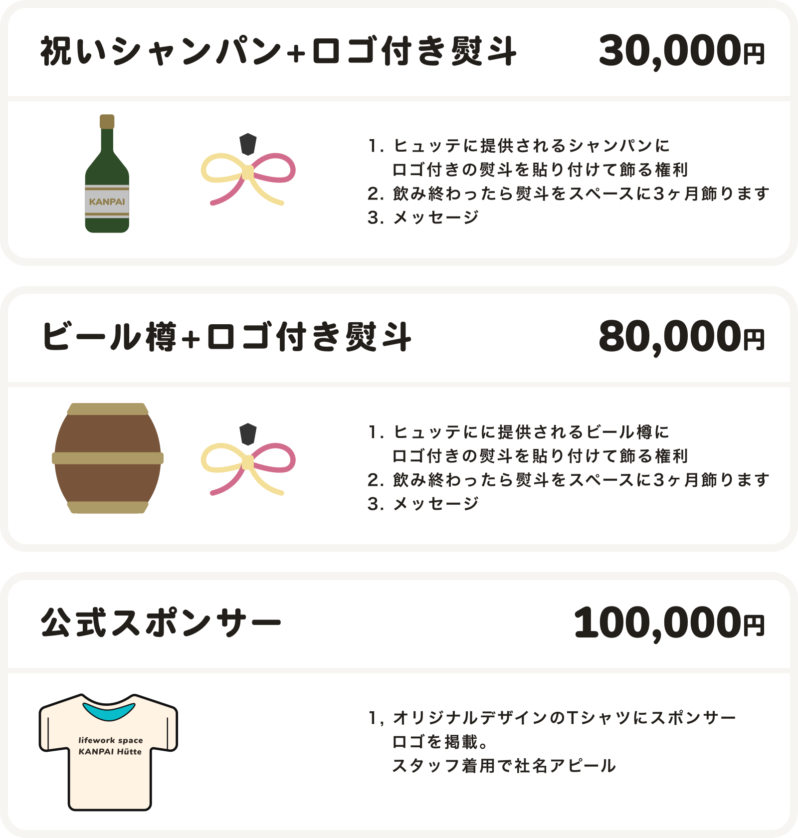 カンパイヒュッテを通じて、企業やお名前を広げていきたいかた向け!ロゴを載せたり告知をしていく代わりに、パートナー料・祝い酒代などをいただきます!