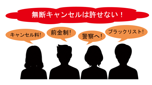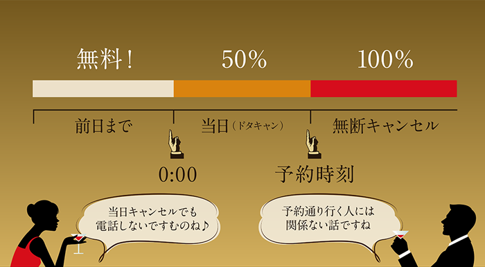 当日キャンセル(ドタキャン)はキャンセル料として50%が、無断キャンセルは100%が決済されるしくみです。