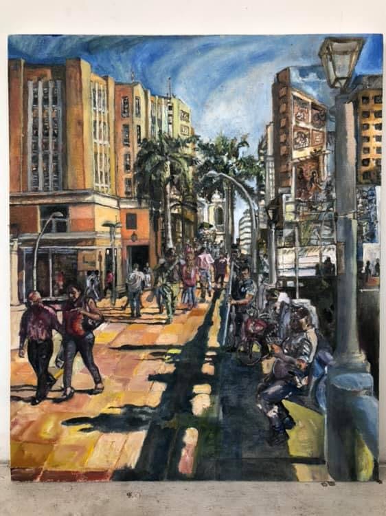 今回、旅行画家として背中を押していただいた後、初めて描いた作品「リオ・デル・ボリバールの夕暮れ」(コロンビア、カリ)です。この場所は、コロンビアの中でも特に治安が悪いと言われるカリのダウンタウンのど真ん中にあるオアシスのような空間です。夕暮れ時にこの場所に来ると街灯や人々の陰が細長く伸びるのが印象的だったので「この影は絶対に描きたい!!」と思いました。それから夕暮れらしさを出すためにワザと床の色を「夕暮れ色」に染めてみました。初めてプロを意識して描いた非常に思い入れのある作品です。