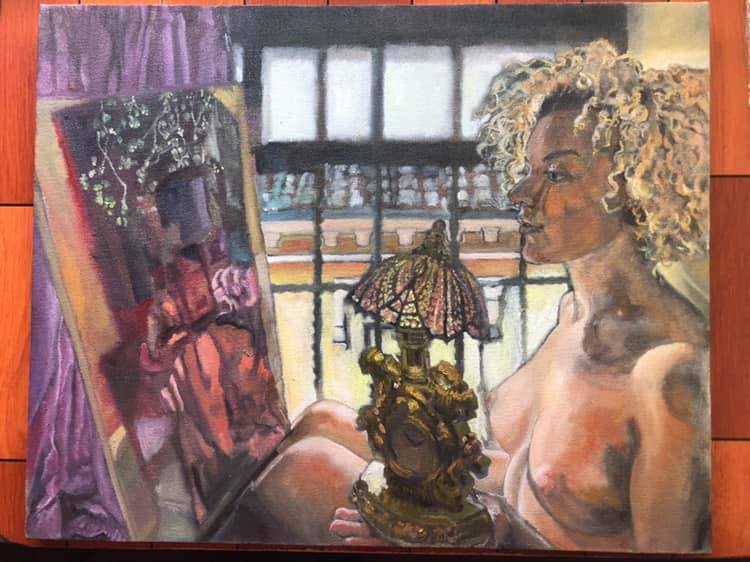 エクアドルのキトで出会ったベネズエラからの経済避難民の1人、俳優志望の女性をモデルに描いた「セレステ」です。いきつけのレストランで偶然知り合った女性セレステと色々夢について話しあって意気投合している内に「モデルになってくれない?モデル代は出世払いになるけど、、、」と頼んだのがキッカケでした。最初ヌードを描くつもりは無かったんですが、僕の部屋に来てもらって色々ポーズを取ってもらって構図を考えてる内に、「ヌードの方がいいんじゃない?」と彼女の方から提案してもらいました。この作品では窓の外に見える外壁を劇的に明るくすることによって、室内の光量を落とし、彼女が持つ魔力を引き立たせました。僕は遅筆なので一枚一枚の絵に非常に思い入れがあります。