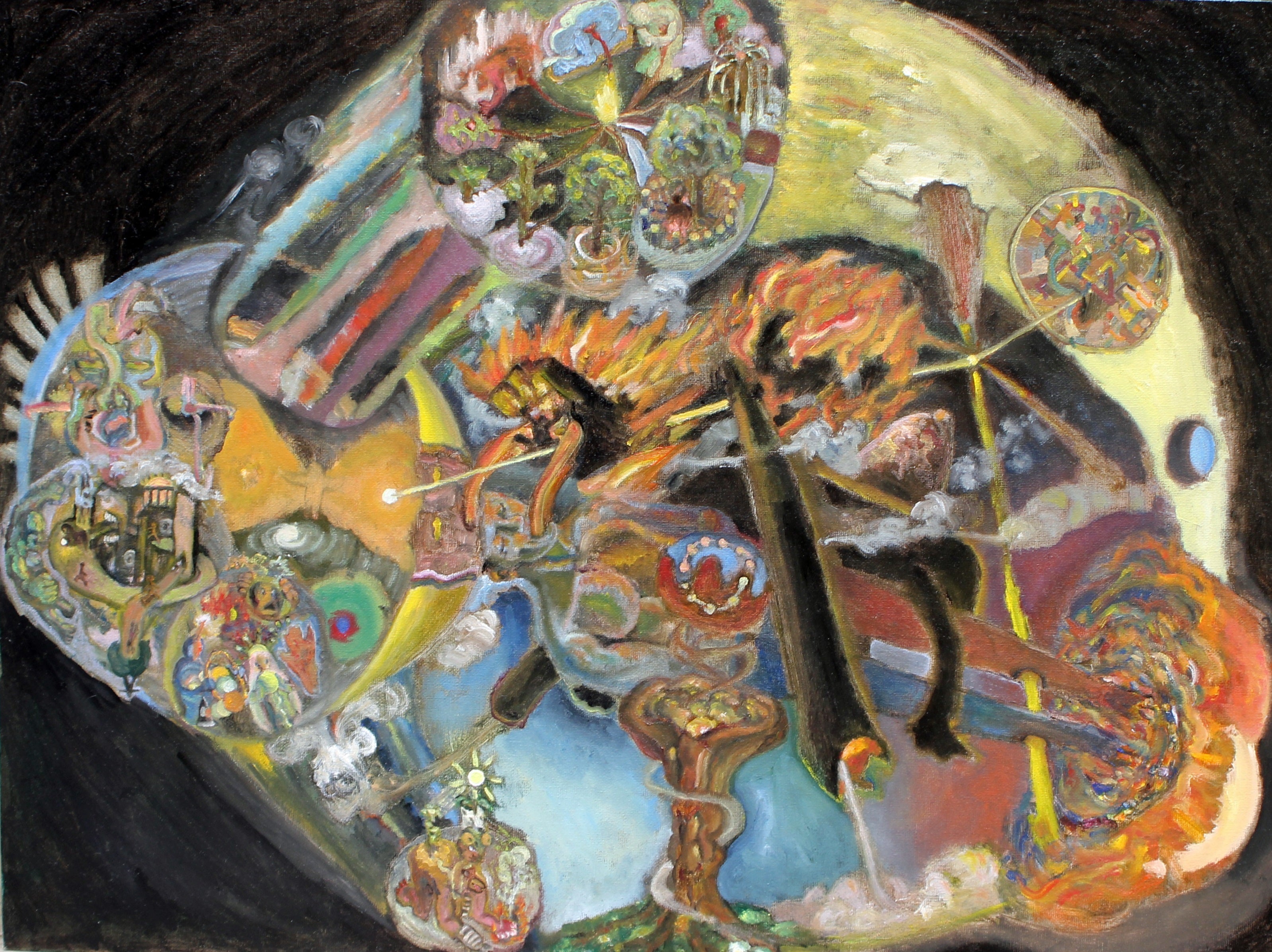 この作品は、強い抗精神性をもつアマゾンの薬草「アヤワスカ」を飲んだ時の体験を思い出しながら描きました。まずこの作品で強調していることはサイクル、循環といった自然の法則のようなものです。そしてここでは「個」「種」「男性」「女性」「植物」といった様々な概念が共通エネルギーによって動いているということです。中央に眠っている人物は僕公理自身で、口にはアヤワスカが注入されています。僕の上にまたがっている怪獣のようなものは燃え盛る焚火で、焚火の中で雄叫びを上げているのは儀式を執り行ってもらったシャーマンの陰です。この様に今後、イメージの世界もどんどん絵にして行きたいと思っています。