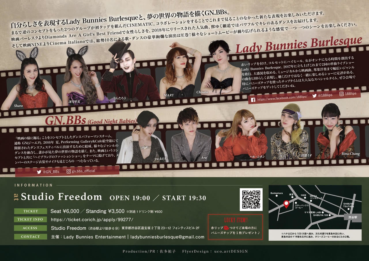 赤いリップ💋を付け、コルセットにハイヒール👠女がオンナになる時間を創出するLady Bunnies Burlesqueと、『映画の様に踊る』ことをコンセプトとしたダンスパフォーマンスチームGN.BBs。