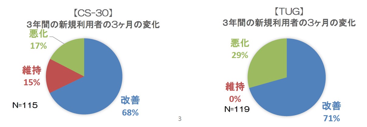 りぷらすのデイサービスに来ると、利用後3ヶ月で70〜80%の人は、利用前より改善します。