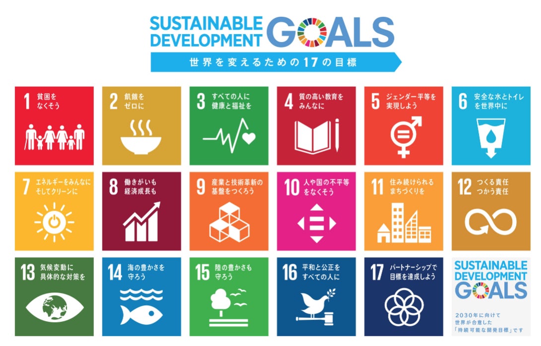 2015年9月の国連サミットで採択された「持続可能な開発のための2030アジェンダ」にて記載された2016年から2030年までの国際目標です。持続可能な世界を実現するための17のゴール・169のターゲットから構成され,地球上の誰一人として取り残さない(leave no one behind)ことを誓っています。(https://www.mofa.go.jp/mofaj/gaiko/oda/sdgs/about/index.html)
