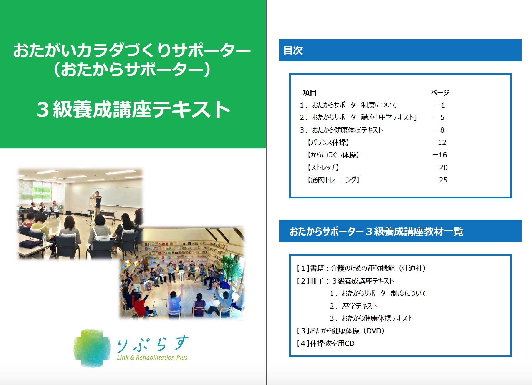 おたからサポーター養成講座では、骨や筋肉、関節の運動、簡単なストレッチと筋力トレーニング、二重課題の運動です。