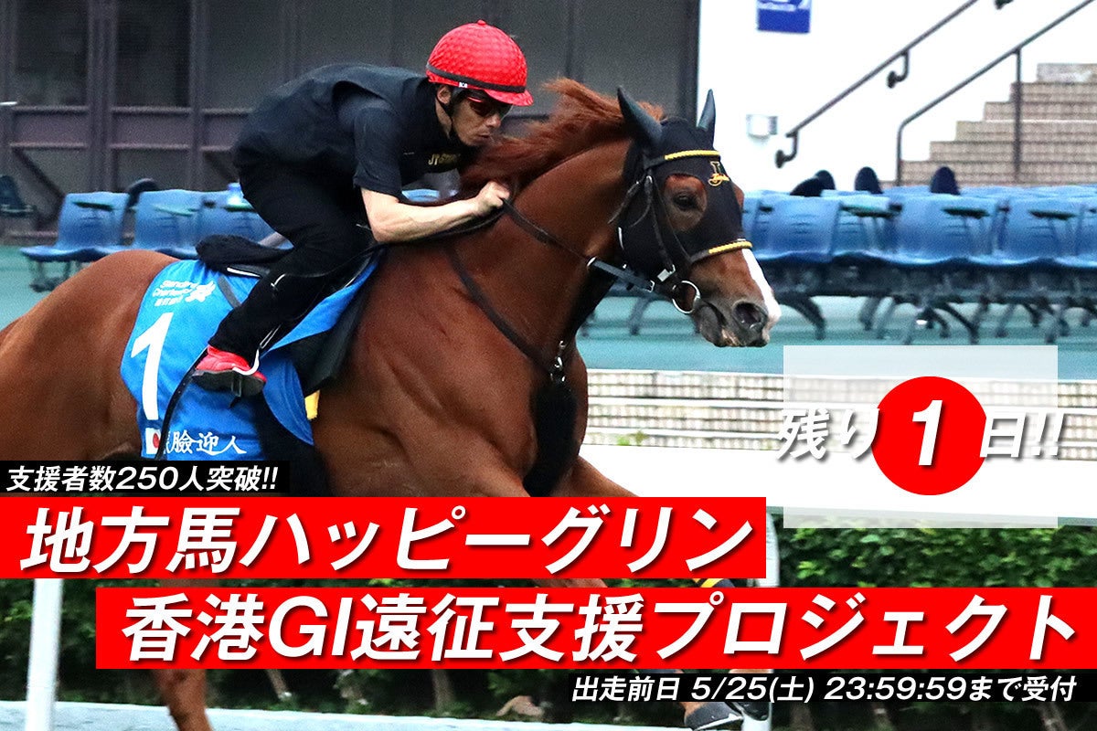 2019/05/20 22:54本日、何と支援者数が200人を突破いたしました!!たくさんの皆様のご支援、本当に感謝です。また、先週も本プロジェクトの事を紹介しきれないくらいたくさん記事にして頂きました。・ハッピーグリン出走26日香港G1、登録馬は11頭 (日刊スポーツ様)・無謀ではないハッピーグリン香港G1挑戦 (デイリースポーツ様)・ハッピーグリンが香港G1に選出、18日に現地へ向け出発(netkeiba.com様)・【こちら日高支局です・古谷剛彦】地方から香港G1制覇の夢を追うハッピーグリン (スポーツ報知様)この先も続々と取材依頼が入っており、現役競走馬の海外遠征の新しい形として注目度が上がっている事がひしひしと伝わって来ます。引き続き、皆様のお力添えをお待ちしておりますので、宜しくお願いいたしますm(__)m もっと見る