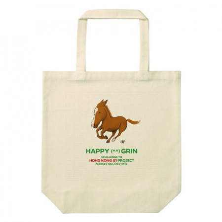 先程、ウマデザイナーのショーゴさんデザインの「ハッピーグリン トートバッグ(香港GI挑戦プロジェクト仕様)」をリターンに設定させて頂きました。