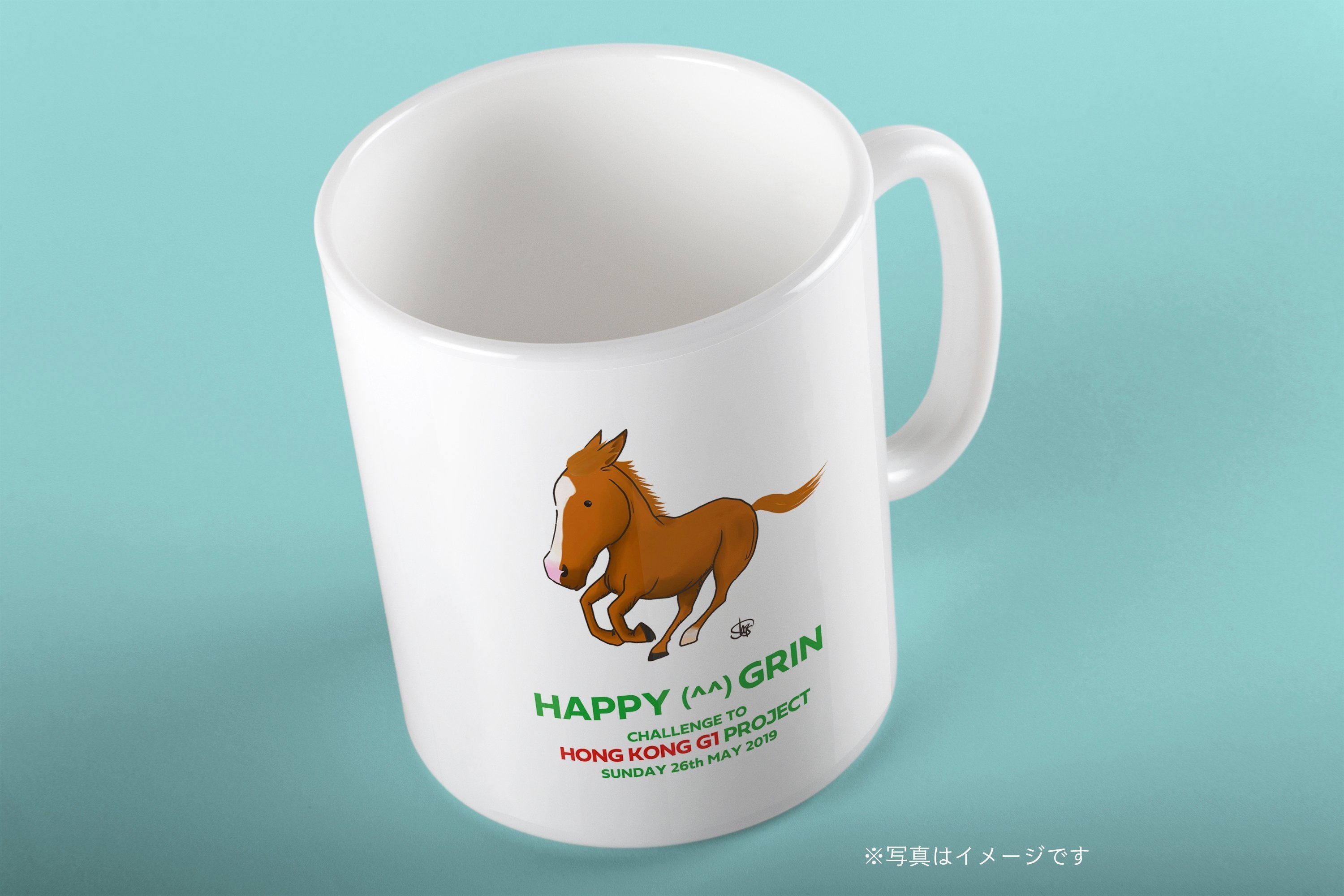 先程、ウマデザイナーのショーゴさんデザインの「ハッピーグリン マグカップ(香港GI挑戦プロジェクト仕様)」をリターンに設定させて頂きました。