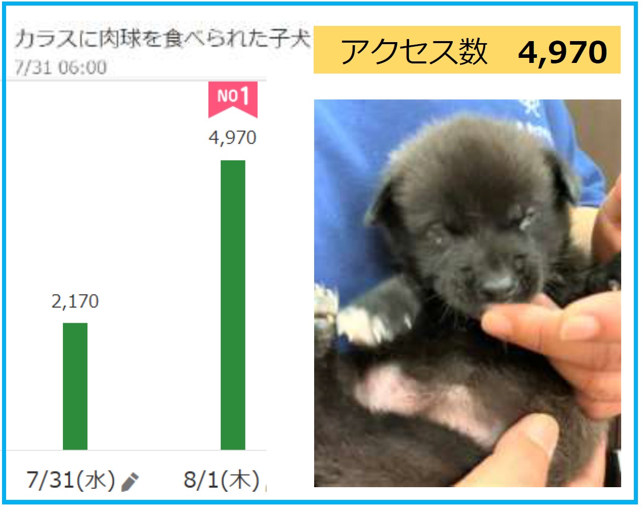 公式ジャンルには「犬・保護活動」と「猫・保護活動」があるのですが、1つしか選択できないので「犬・保護活動」に参加しています。参加177団体で、青い鳥は常に15位前後でしたが、7月31日の記事「カラスに肉球を食べられた子犬」が大勢の方に注目されジャンル5位になりました。