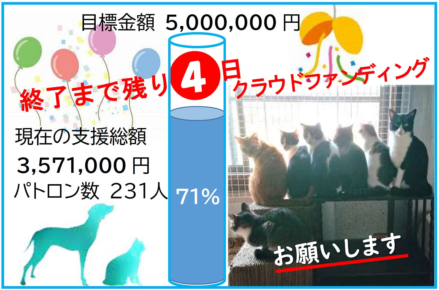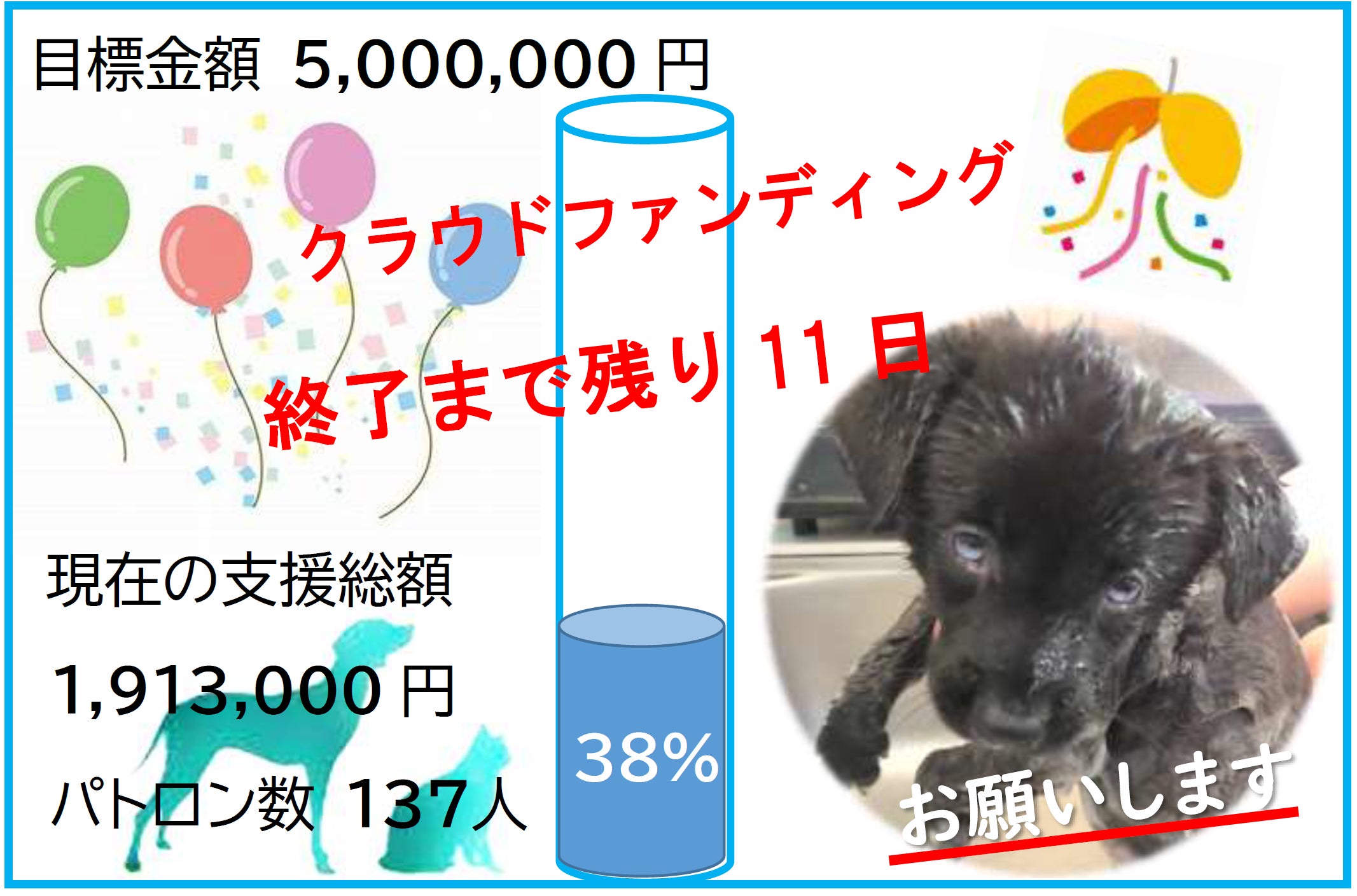 そして残り4日のご支援をお願い申し上げます。できることなら目標額を達成したい。殺処分される犬たち猫たちを1匹でも多く救い出し、「生きてもいい場所」を確保してやるために・・・。
