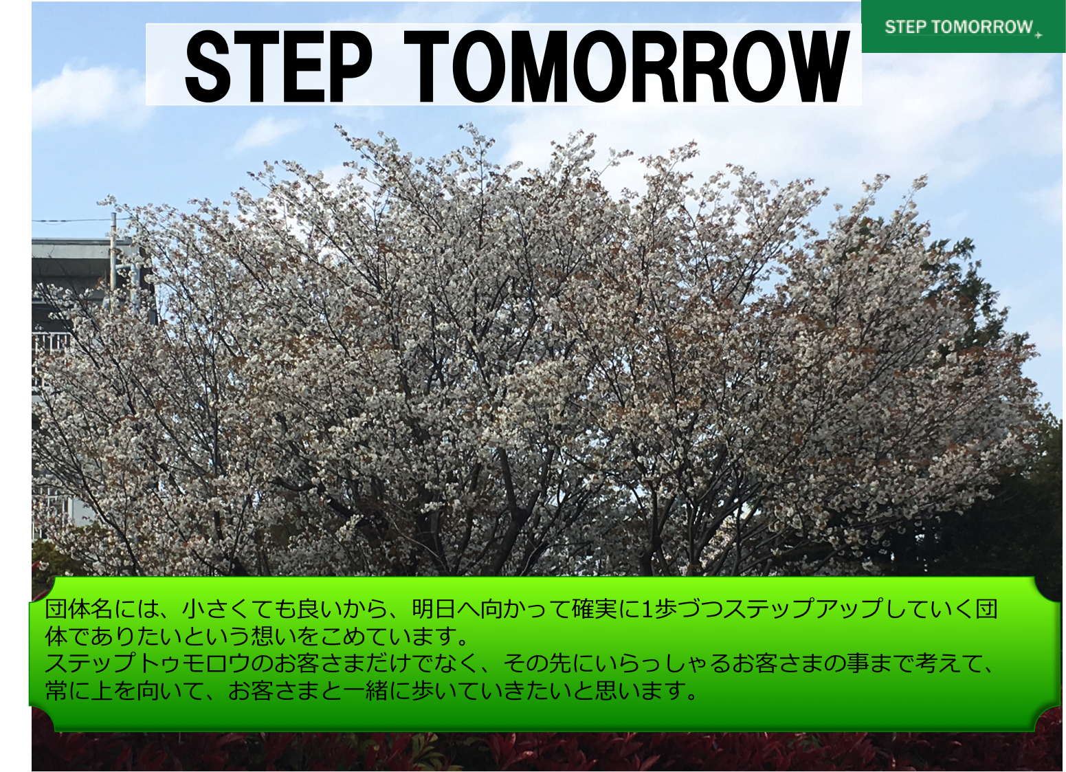 団体名には、小さくても良いから、明日へ向かって確実に一歩づつステップアップしていく団体でありたいという想いをこめています。