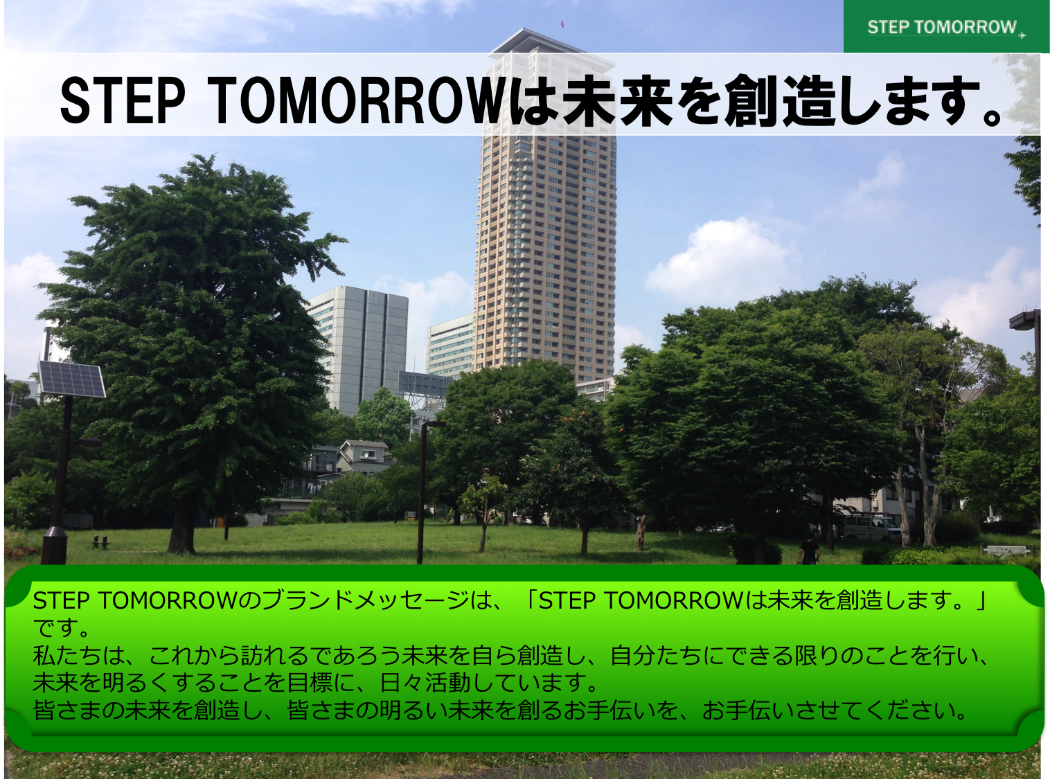 STEP TOMORROWのブランドメッセージは、「STEP TOMORROWは未来を創造します。」です。