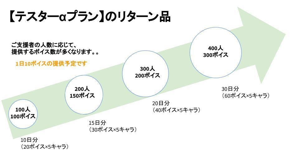 2019/05/19 20:12みなさん、こんばんは。キャラトーク運営です。【テスターαプラン】のリターン品およびサービス詳細を追記いたします。リターン品についてご支援者の人数に応じて、聞けるボイス数を増やすようにしました。(1日10ボイスを聞ける予定です)◇一覧・ご支援者:100人 → 100ボイス 10日分(20ボイス×5キャラ)・ご支援者:200人 → 150ボイス 15日分(30ボイス×5キャラ)・ご支援者:300人 → 200ボイス 20日分(40ボイス×5キャラ)・ご支援者:400人 → 300ボイス 30日分(60ボイス×5キャラ)ボイス受け取り機能について聞く時間帯によって、ボイスの内容が変わります。スタンプラリーの要素を取り入れましたので、お楽しみ頂けますと嬉しいです。。マイページ機能についてテスタープランでは、簡易的なログイン機能があります。マイページ画面では、ご支援者の方のクレジット表記やボイス獲得率といったものをご確認頂けます。その他機能について調達金額やご支援者の人数に応じて、機能を追加していこうと考えています。また、ご支援者に欲しい機能のリクエストを求めるアンケートも実施いたしますんので、あなたの夢を教えてください。。それでは、引き続きよろしくお願いいたします。キャラトーク 上野 もっと見る
