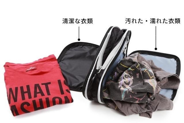 トラべラブ圧縮バッグには、2つの収納コンパートメントがあります。片方に綺麗な衣類を入れて、もう片方に汚れた衣類を収納することができます。