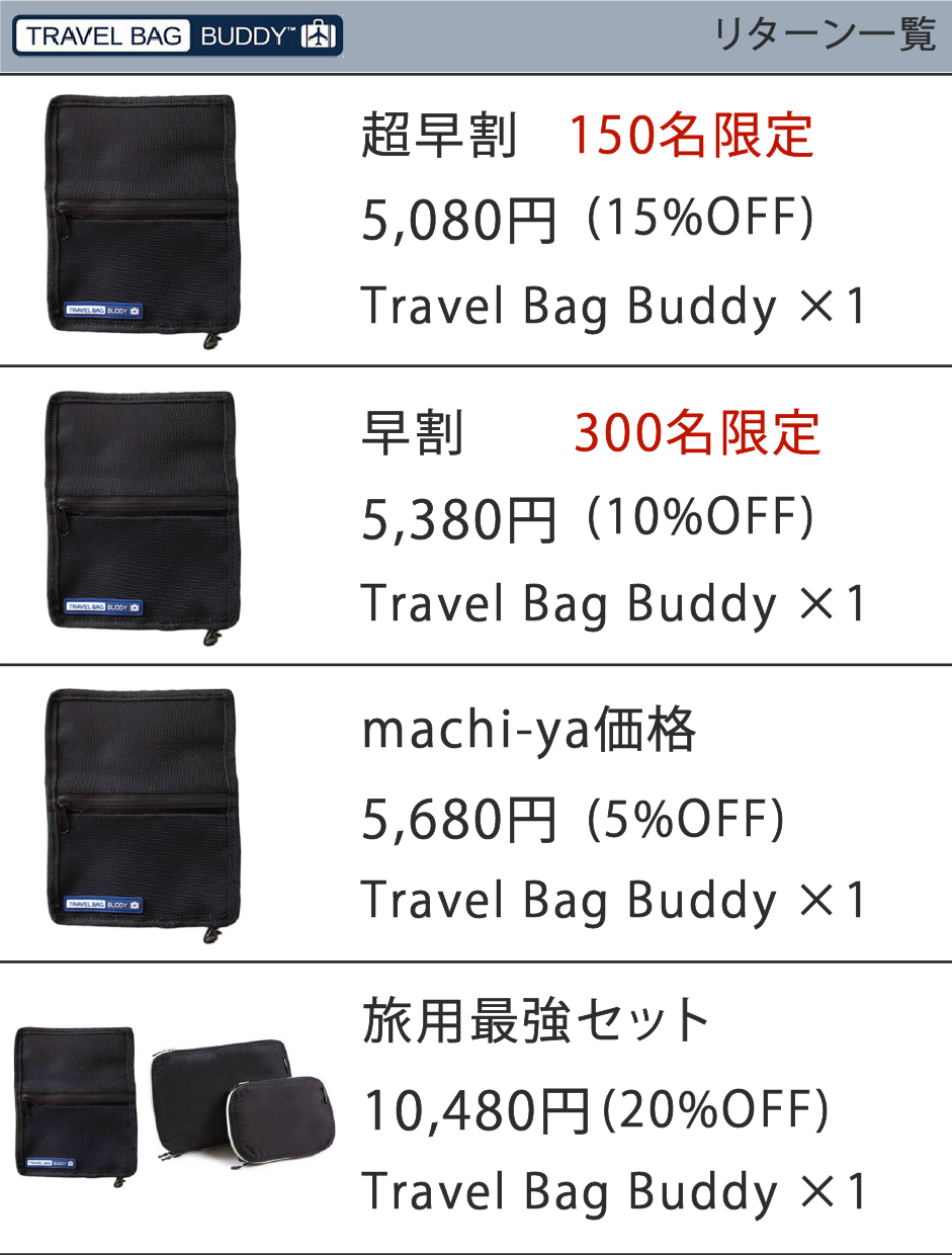 すぐに取り出さないといけないパスポートや航空チケット、スマホ、クレジットカード等の重要アイテムたちはTravel Bag Buddyに入れておけば更に便利!この「旅用最強セット」は、本プロジェクトにおいて最も割引率の高い(20%OFF)お得なリターンです。