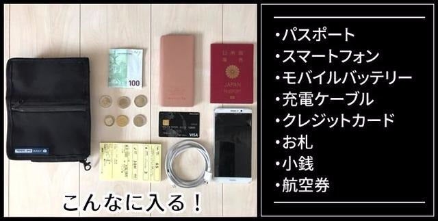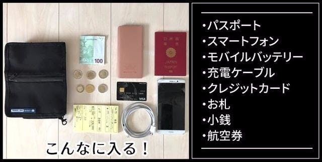 財布、スマートフォン、パスポート、キーホルダー、クレジットカード、航空券、小銭、リップクリーム、モバイルバッテリー、充電ケーブル類、ポケットWi-Fiなど