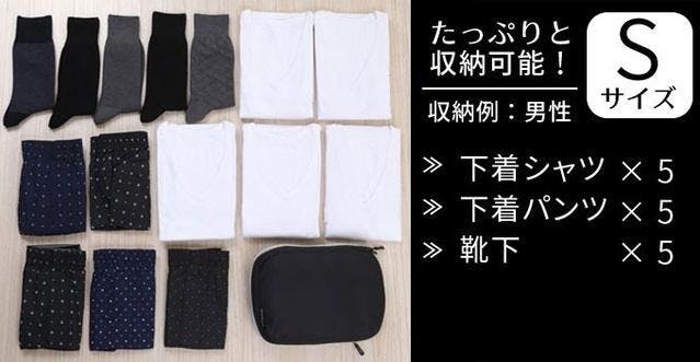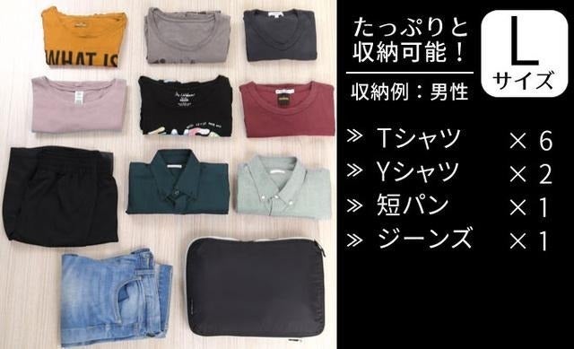 今回はLサイズとSサイズがそれぞれ1つずつセットとなる販売形態となります。見た目には小さいトラべラブ圧縮バッグですが、実際は多くの衣類が入ることが写真でわかりますね。