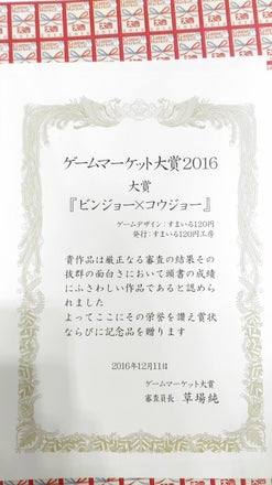 お世話になっております。 本日12/11、ゲームマーケット秋の会場でゲームマーケット大賞2016の発表が行われ、ビンジョー×コウジョーが大賞を受賞しました! 数々の同人ゲームの中から選ばれたことをとても嬉しく思っています。これに関連して、いくつかご連絡があります。 「大賞受賞シール」について さて、ゲームマーケット大賞受賞につきまして、写真の賞状の背景に映っている「ゲームマーケット大賞受賞シール」を特典として頂きました。 こちらのシールを増産したビンジョー×コウジョーにもれなく張りたいと考えています。(十分に量があるため、全てのリターンに張ることが可能です) 第一版との差別化を図りつつ、「お墨付き」ということでご家族やご友人と遊ぶきっかけになればと思います。 説明書について 大賞受賞時にも審査員の方から指摘を頂いた説明書の改善も着々と進んでおります。そちらについても纏まり次第、CAMPFIREページでご報告させて頂ければと思います。 細かい進捗はTwitter(@sssaikou2003)の方で報告していますので、ご興味があればフォローして頂ければ幸いです。 他にもご連絡すべきことが幾つか御座いますが、本記事内で扱うには蛇足となりますので、また別途お知らせさせて頂きます。 現時点ですでに目標金額の150%以上と沢山のご支援を頂いて、驚きつつ、嬉しく思っています。ご期待に沿えるよう頑張っていきますので、今後とも応援のほど宜しくお願いします。