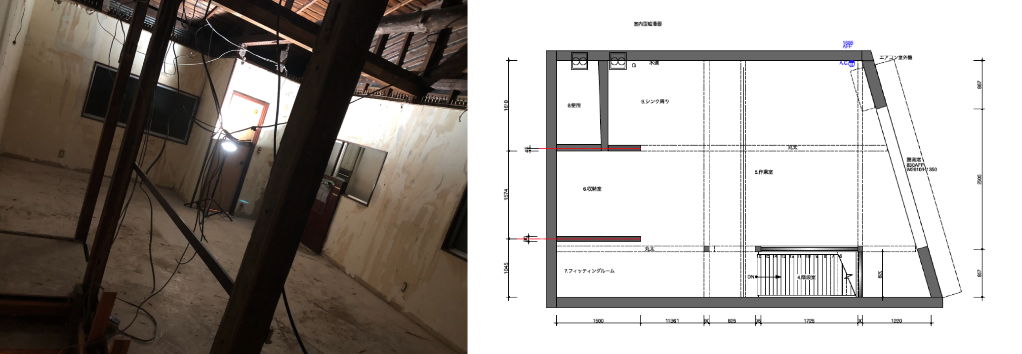 天井板を取り払い、開放感のある広々とした空間にする予定です。ワークショップやイベントの無い日でもコーヒーブレイク等、ご自由にご利用頂ける大きなテーブルを配置し、ワークショップで制作したものやご購入頂いたものをすぐにお試し頂けるフィッティングルームもご用意します。