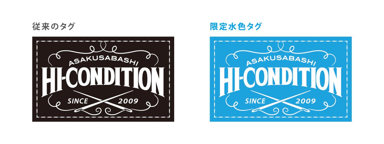 また今回、ほぼ全ての製品に使用しているHI-CONDITIONのタグは通常の黒色のタグではなく、クラウドファンディング限定の水色タグをご用意いたしました。