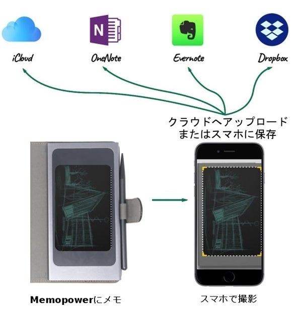 書いたメモはスマホで撮影すれば、iCloud、Evernote、OneNote、Dropboxなどにアップロードすることができます。