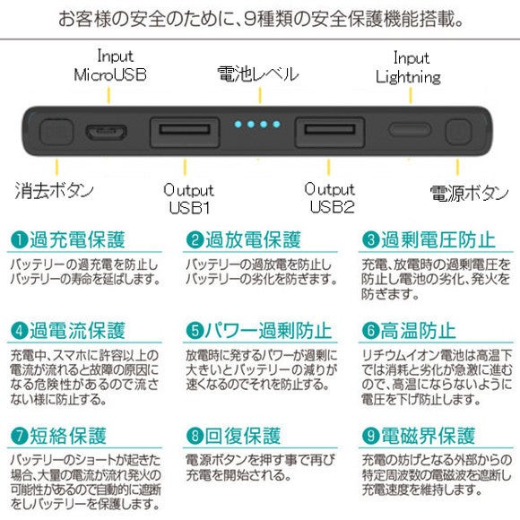 ●本体への充電は「MicoroUSB」「Lightning」両方に対応。