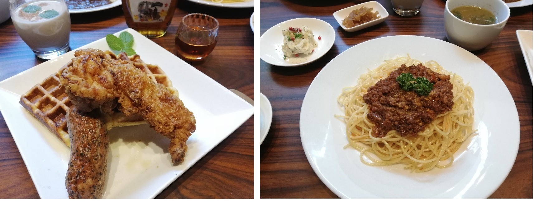 「ワッフルダイナー」のワッフル&フライドチキン&無添加ソーセージのコンボ(左)と「ミートソース軒」のリアルミートソース(右)。いずれも無添加。