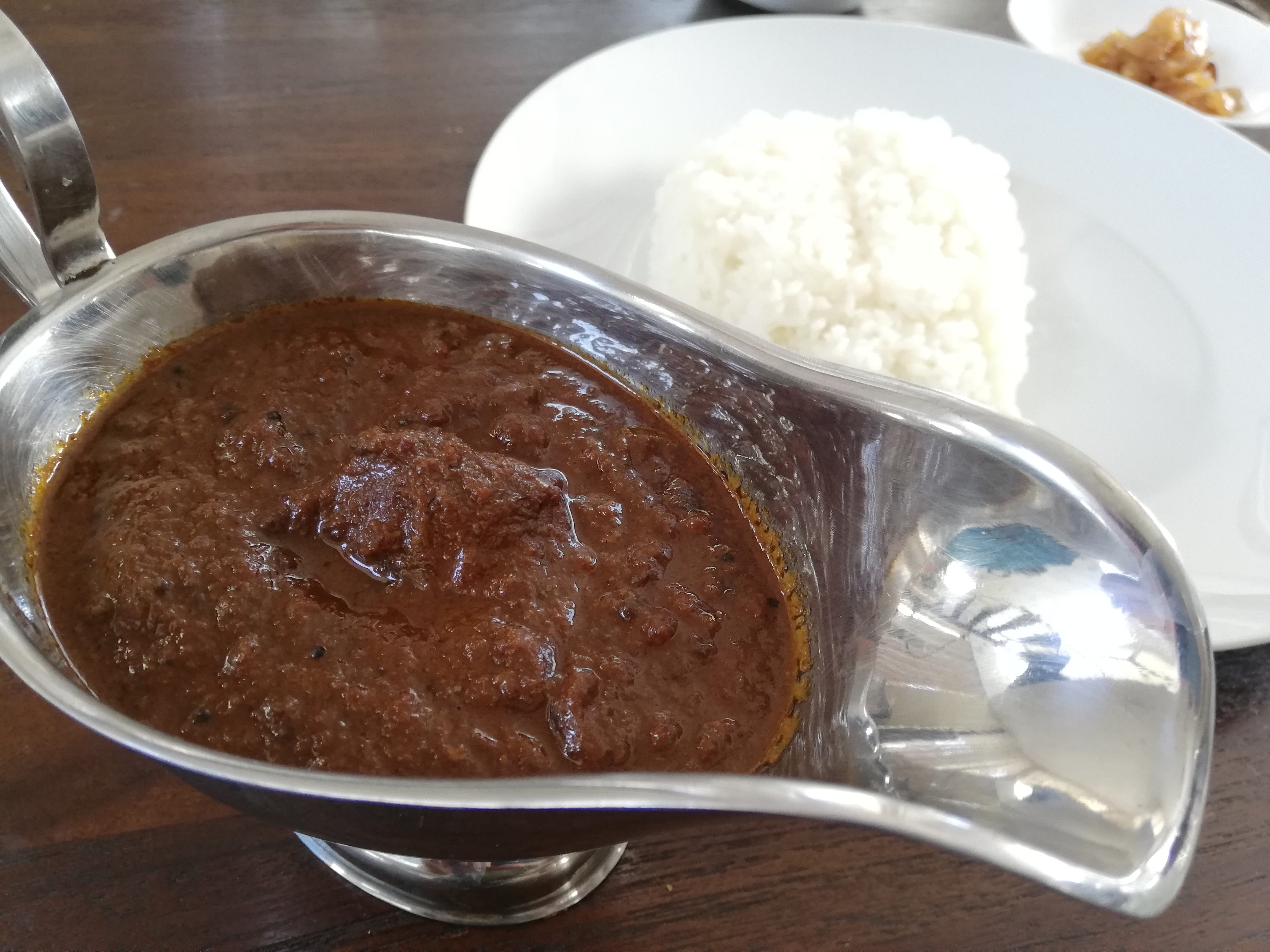 当店のカリーはとても時間と手間を掛けております。カリーには小麦粉は使用しておりません。鉄板ではありますが、よく炒めた玉ねぎを多く使用しております。そこに野菜とハーブをミキサーに掛けたジュースと牛、鶏、野菜、ハーブから取ったストックでコクと旨味を出していきます。スパイスもホールとパウダー、さらに粗挽きをポイントとなる段階で要所で投入します。
