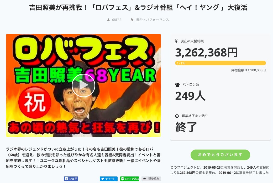 この記念すべきロバイヤーの最もスペシャルな一日を「ロバフェス」と題し、吉田照美さんがクラウドファンディングに初挑戦、一度は失敗したものの、再挑戦では見事!249人 のパトロン得て、総額3,24962,368円をご支援いただき まして「ロバフェス」クラウドファンディングは大成功となりました!
