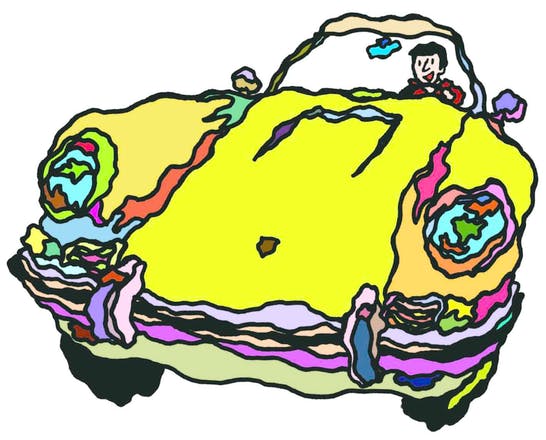 綿のキャンバスにアクリルガッシュを何層にも塗り重ねる事で表現されるPOPな乗り物たち。