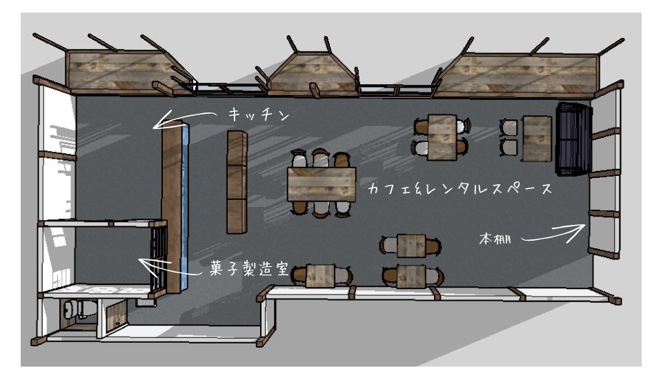 ここを、菓子製造許可付きのキッチンスペース、カフェ機能、レンタルスペースとして利用できる場所へ改修し、7月上旬のオープンを目指しています。