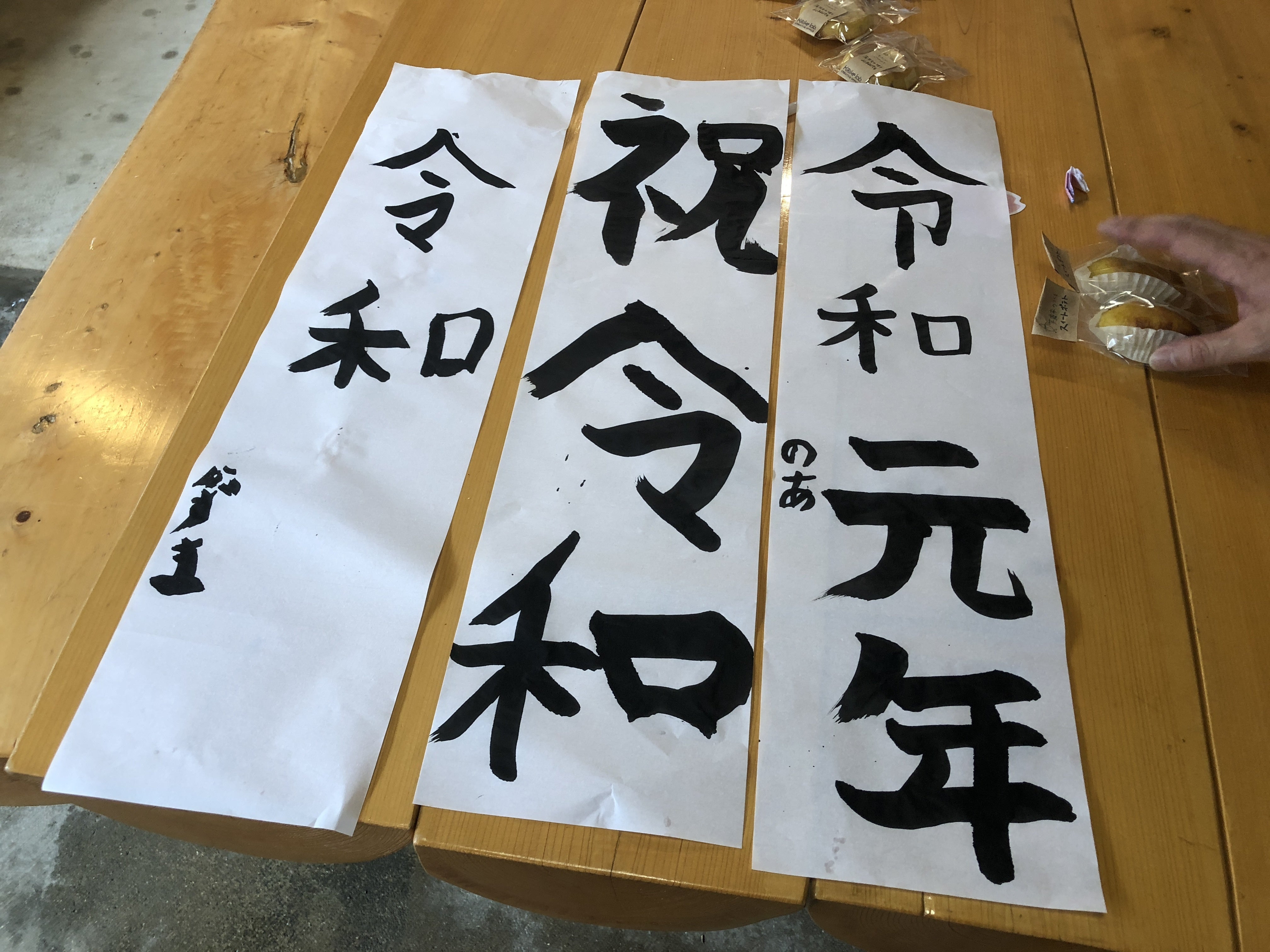 祝・令和を書いていると、子どもたちが「なにしてるの〜?書きたいー!」と駆け込んできて、書道教室のようになったり、