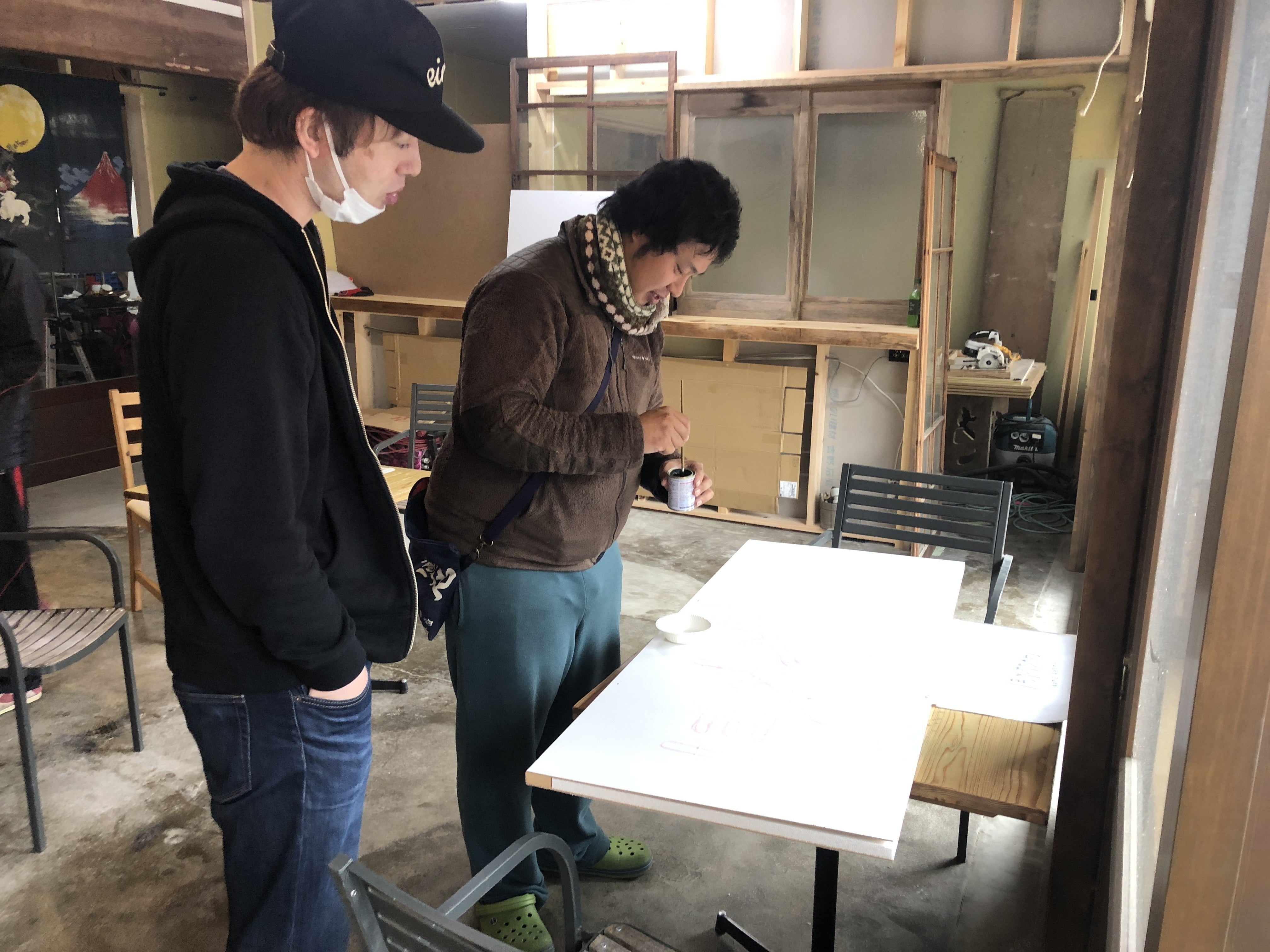 そんな看板を表に出して、物販をしつつ、中では机のリメイク作業。