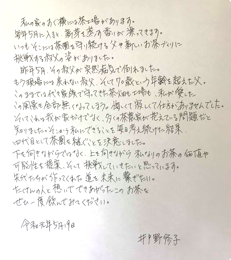 はじめまして。井戸野茶園四代目の井戸野修子と申します。