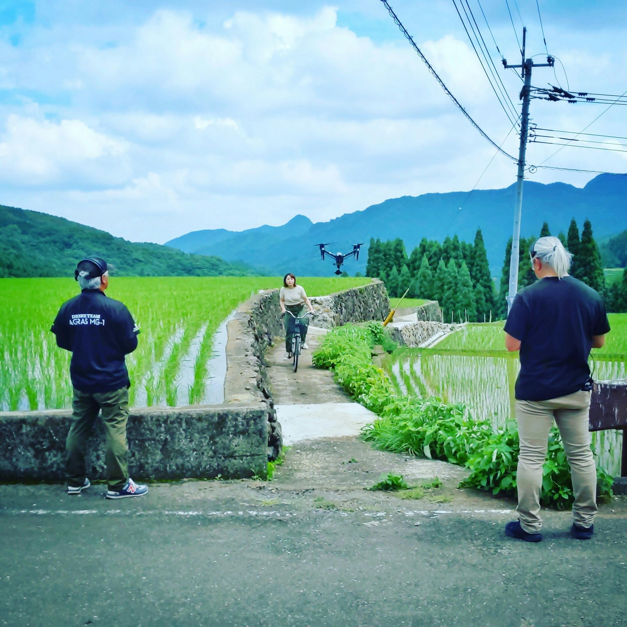 撮影シーンやロケ場所に合わせて小型ドローンや、写真のような2人で操縦して撮影するタイプのものを使い分けています。