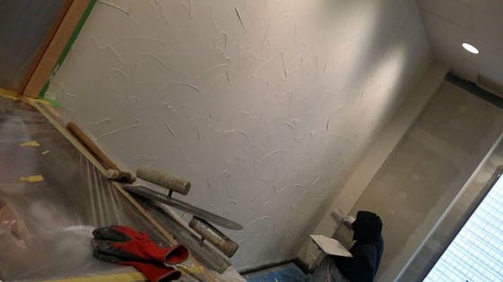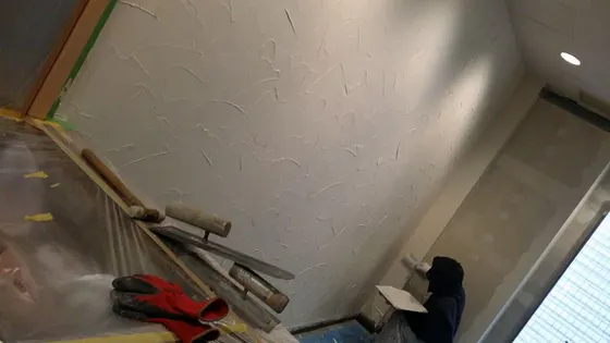 写真は店内壁の仕上げに取り掛かる職人技です。