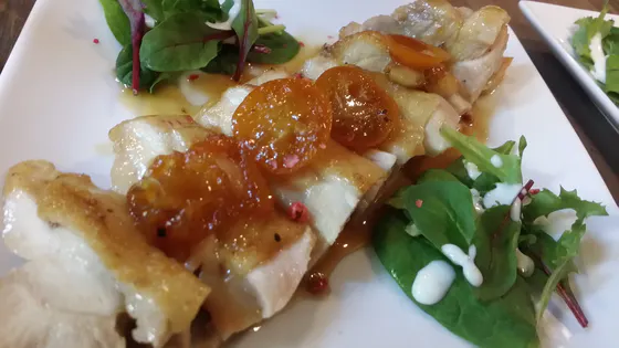 大山鶏をジューシーに焼き、旬の金柑を使った照り焼きソースでいただく一皿です。
