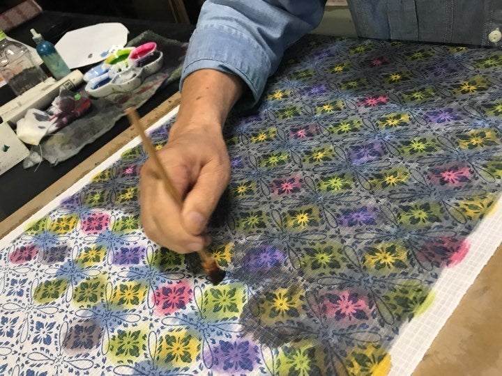 その型紙に小紋糊や友禅糊などで柄を付け、糊を乾かす。