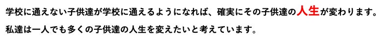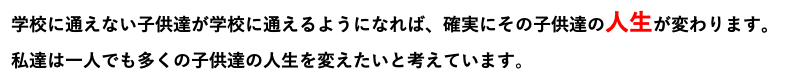 学校に通えていない子供達の現状を見て'' 知ってしまった '' 私達はこの現状を目を瞑って見過ごす訳にはいきません。